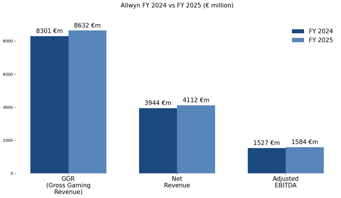 Net revenue reached EUR 4.112bn, up 4% from EUR 3.944bn in 2024. Adjusted EBITDA also rose 4% to EUR 1.584bn, while adjusted profit increased 13% to EUR 509m. Total revenue hit EUR 8.991bn, with GGR at EUR 8.632bn.
