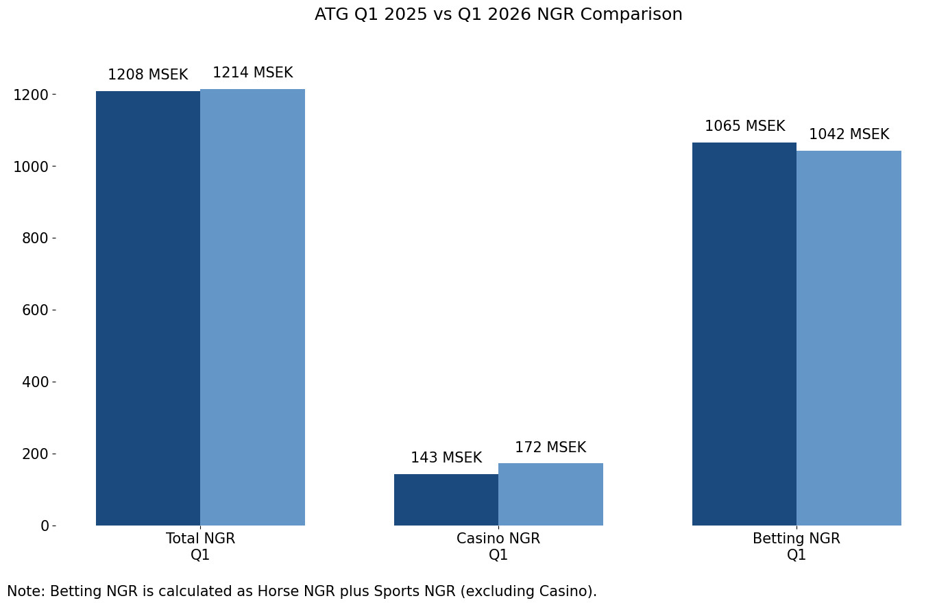 - ATG posted net gaming revenue (NGR) of SEK 1.214bn (ca. EUR 112m) for the quarter, slightly up from SEK1.208bn a year earlier. Operating profit rose to SEK326m, up from SEK267m, reflecting improved cost control and stable income streams.