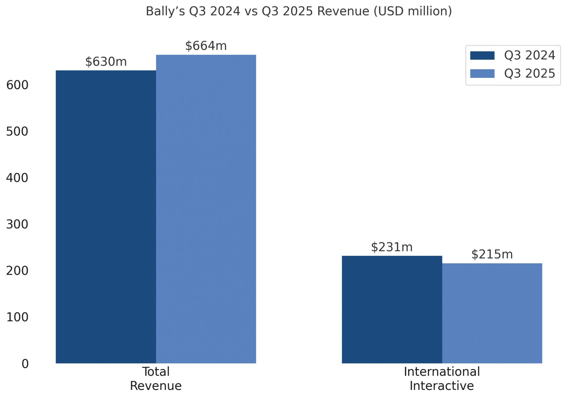 Bally’s Q3 2025 revenue reached USD 663.7m (ca. EUR 572.3m), up 5.4% year on year, mainly led by Casinos & Resorts, which grew 12.1% to USD 396.1m (ca. EUR 341.5m).