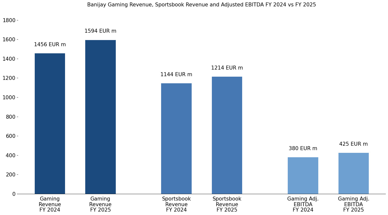 Banijay reported total revenue of EUR 4.88bn in FY 2025, while the gaming division generated EUR 1.59bn. This means the gaming segment accounted for roughly 33% of total group revenue during the year. The Banijay Gaming revenue figure reflects a 10.2% year-on-year increase.