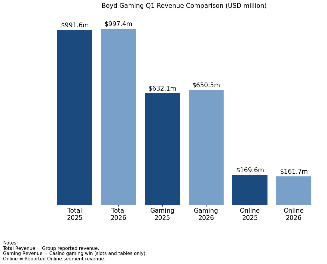 - Boyd Gaming reported total revenue of USD 997.4m (ca. EUR 851m) for Q1 2026, up from USD 991.6m (ca. EUR 846m) a year earlier. Net income came in at USD 105.5m (ca. EUR 90m), down from USD 111.4m (ca. EUR 95m) in Q1 2025.