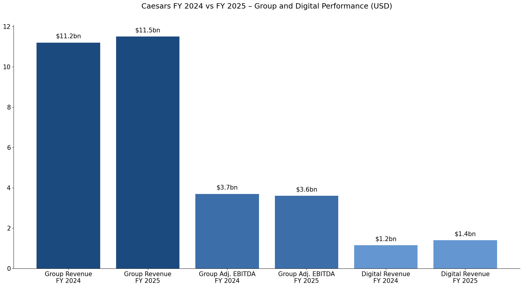 Segment performance in 2025 for the full year was mixed. Las Vegas revenue declined 4.7% to USD 4bn (ca. EUR 3.4 bn) for the year, while Regional revenue increased 3.9% to USD 5.8bn (ca. EUR 4.9bn). Caesars Digital revenue rose 21.1% to USD1.4bn (ca. EUR 1.2bn), with Digital adjusted EBITDA more than doubling to USD 236m (ca. EUR 200m).
