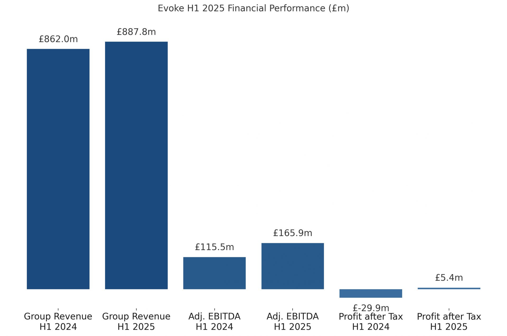 Evoke H1 2025 results point to another solid step in its turnaround. The betting and gaming group delivered its fourth straight quarter of growth and a marked boost in profitability. Adjusted EBITDA climbed 44% year-on-year to £166m, underpinned by efficiency gains and stronger gross margins.