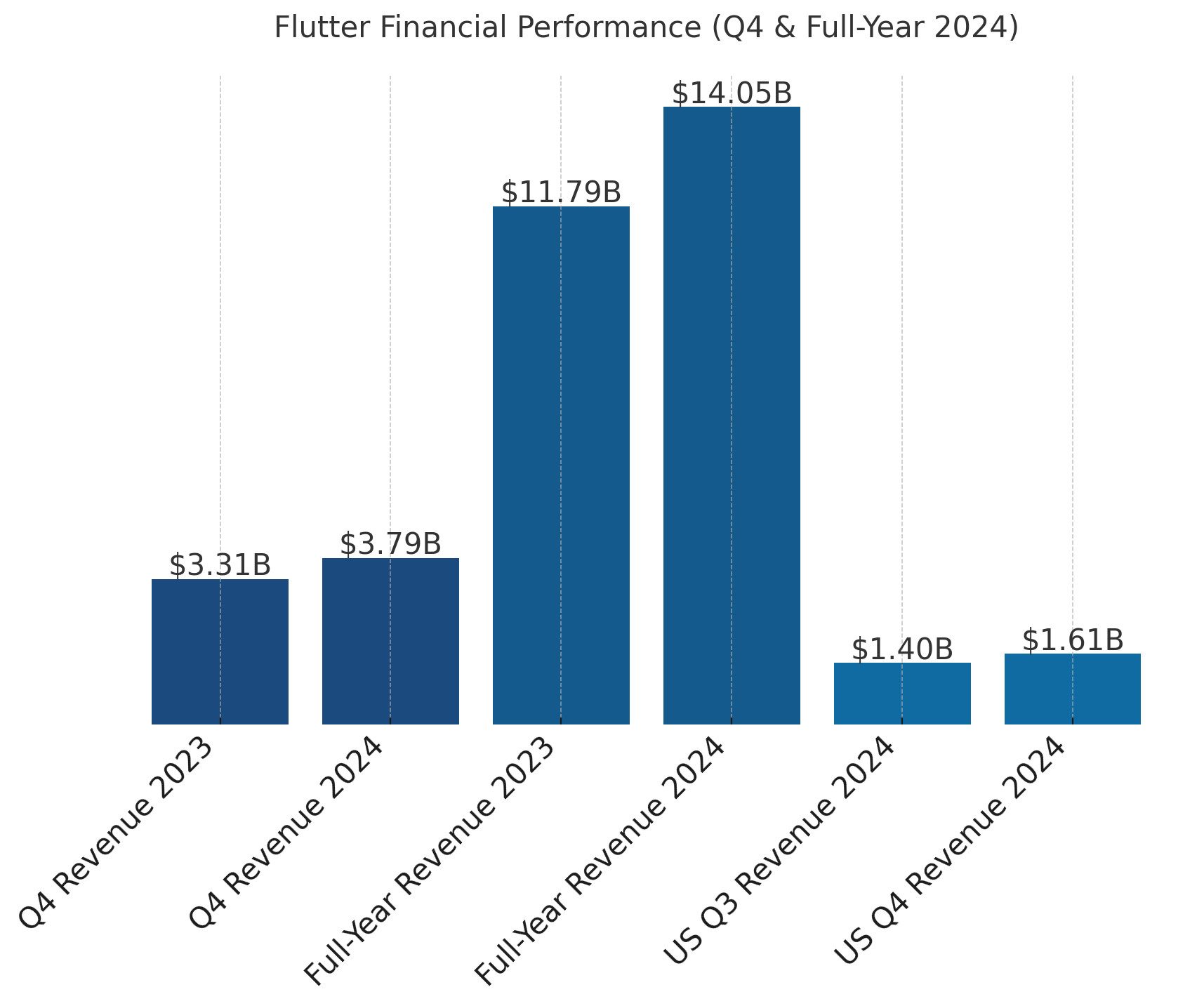 Flutter had a strong Q4 2024, reporting solid financial performance across its global markets. The company’s revenue increased by 14% year-over-year, highlighting its continued expansion. Flutter Q4 2024 earnings also reflect a turnaround in net income, bouncing back from losses in 2023.