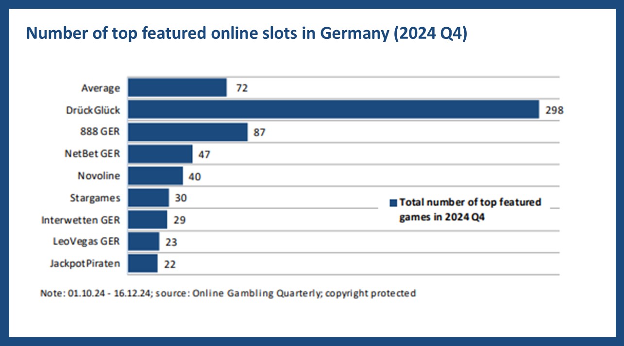 This chart highlights the total number of top-featured online slots across various operators in Germany during Q4 2024.
