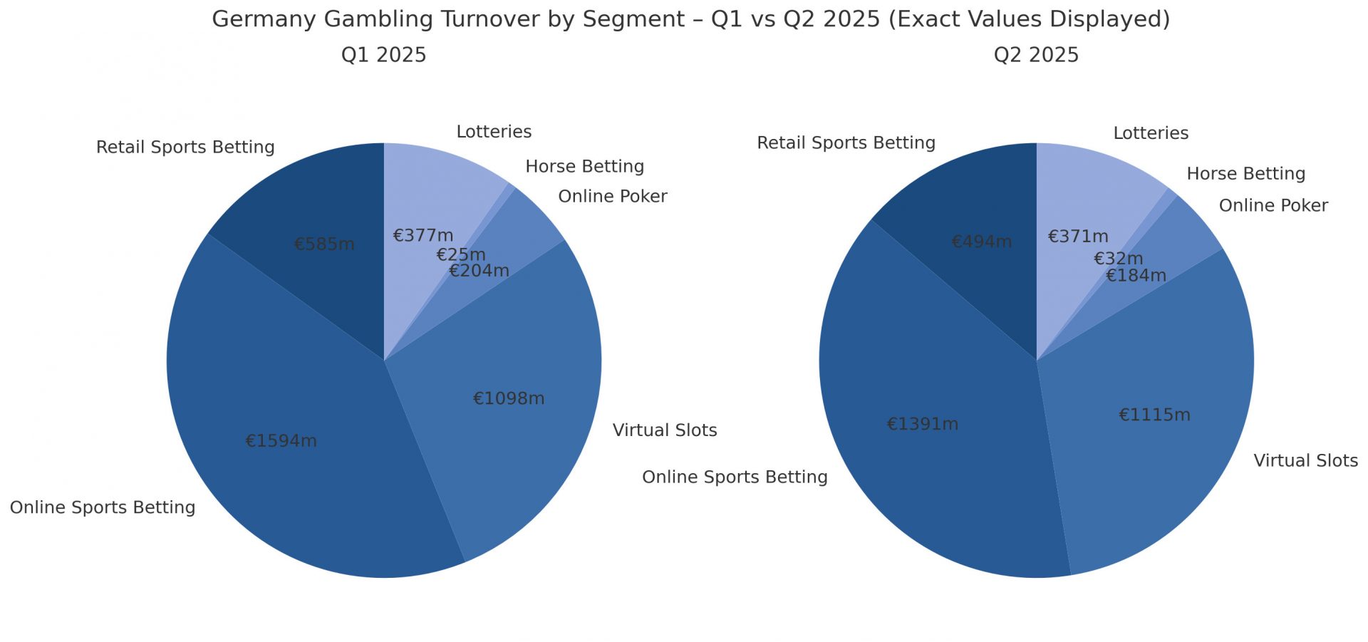 Virtual slot games remained stable. After €1.098bn in Q1, the figure slightly increased to €1.115bn in Q2. This segment continued to be the second-largest in online gambling.