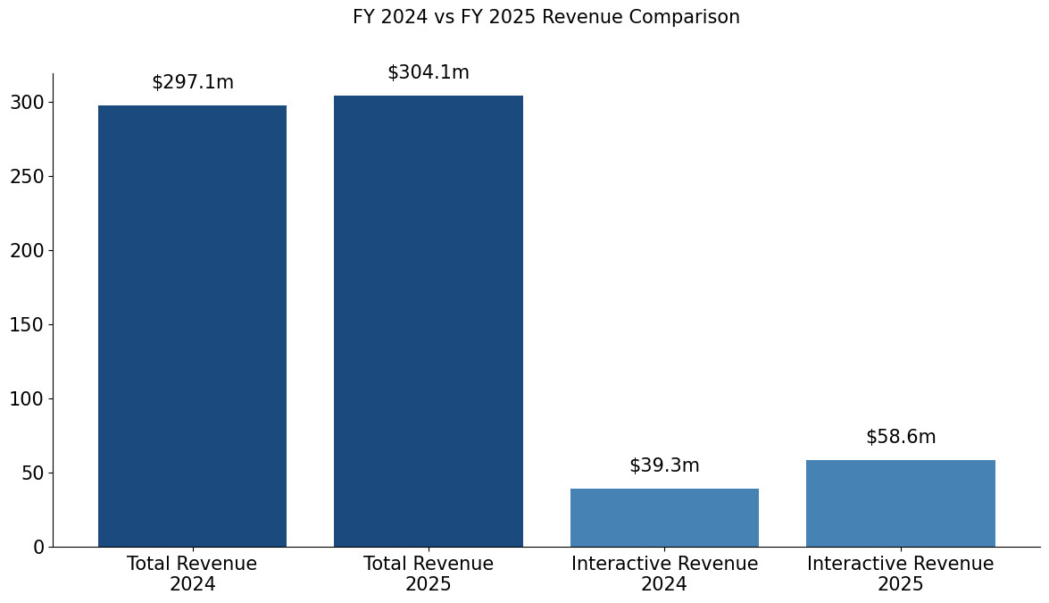 • The Interactive division was the main growth driver across the business with revenue increasing 49% to USD 58.6m in FY2025, up from USD 39.3m in 2024. Adjusted EBITDA from the segment also grew 59% to USD 40.6m as more operators added the company’s online content.