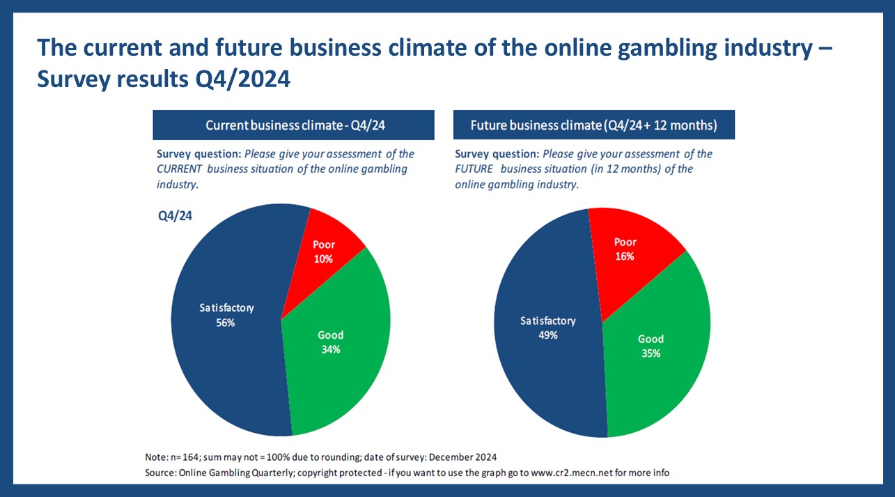 In these analyses, the OGQ takes an in-depth look at the following topic: Online gambling industry climate (Q4 2024). The data research includes a survey of 164 industry participants evaluating the present and expected business climate. Findings highlight fluctuations in business sentiment over time, comparing assessments across different quarters. The analysis also explores trends in market conditions, regulatory challenges, and regional developments affecting industry confidence.