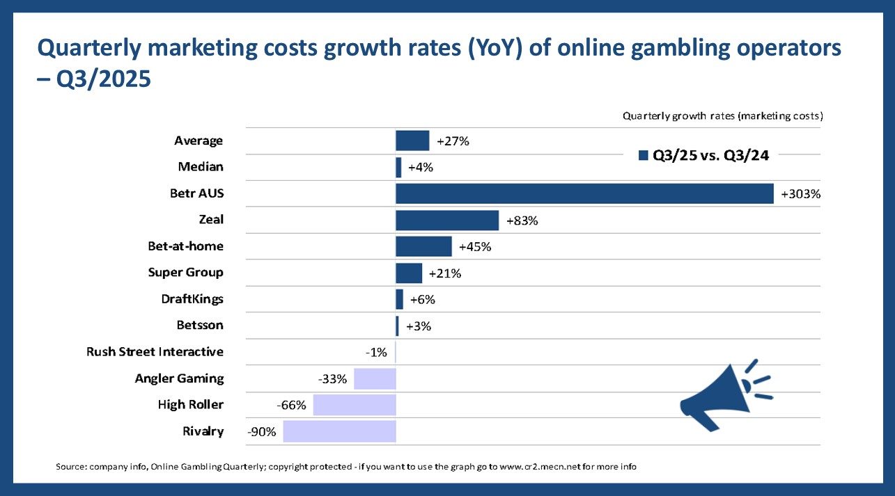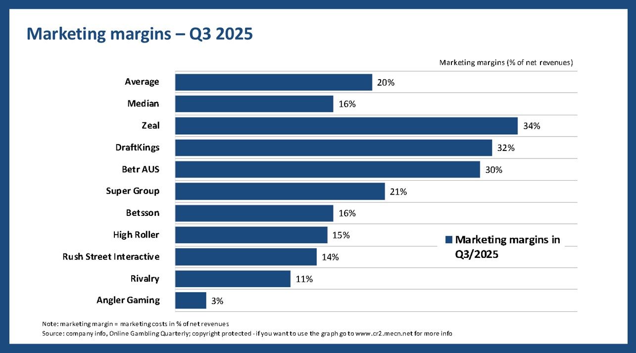 This chart shows marketing costs as a percentage of net revenues for selected online gambling operators in Q3/2025. It highlights clear differences in how heavily companies rely on marketing to drive growth.
