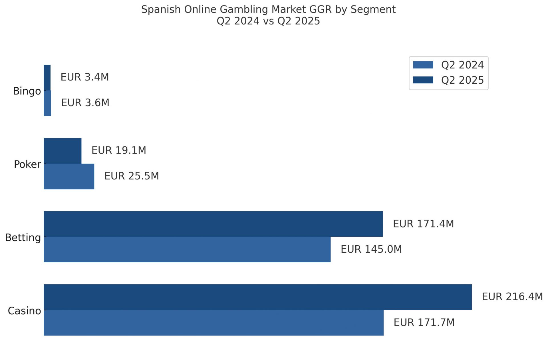 GGR (Gross Gaming Revenue) in the Spanish online gambling market reached ca. EUR 410.3 million in Q2 2025 according to data published by the General Directorate of Gaming Regulation (Dirección General de Ordenación del Juego).  That’s a 2.8% rise on Q1 2025 and an 18.6% increase year-on-year. The online gambling GGR split shows casino still in the lead, followed by betting, poker and bingo. See more details: