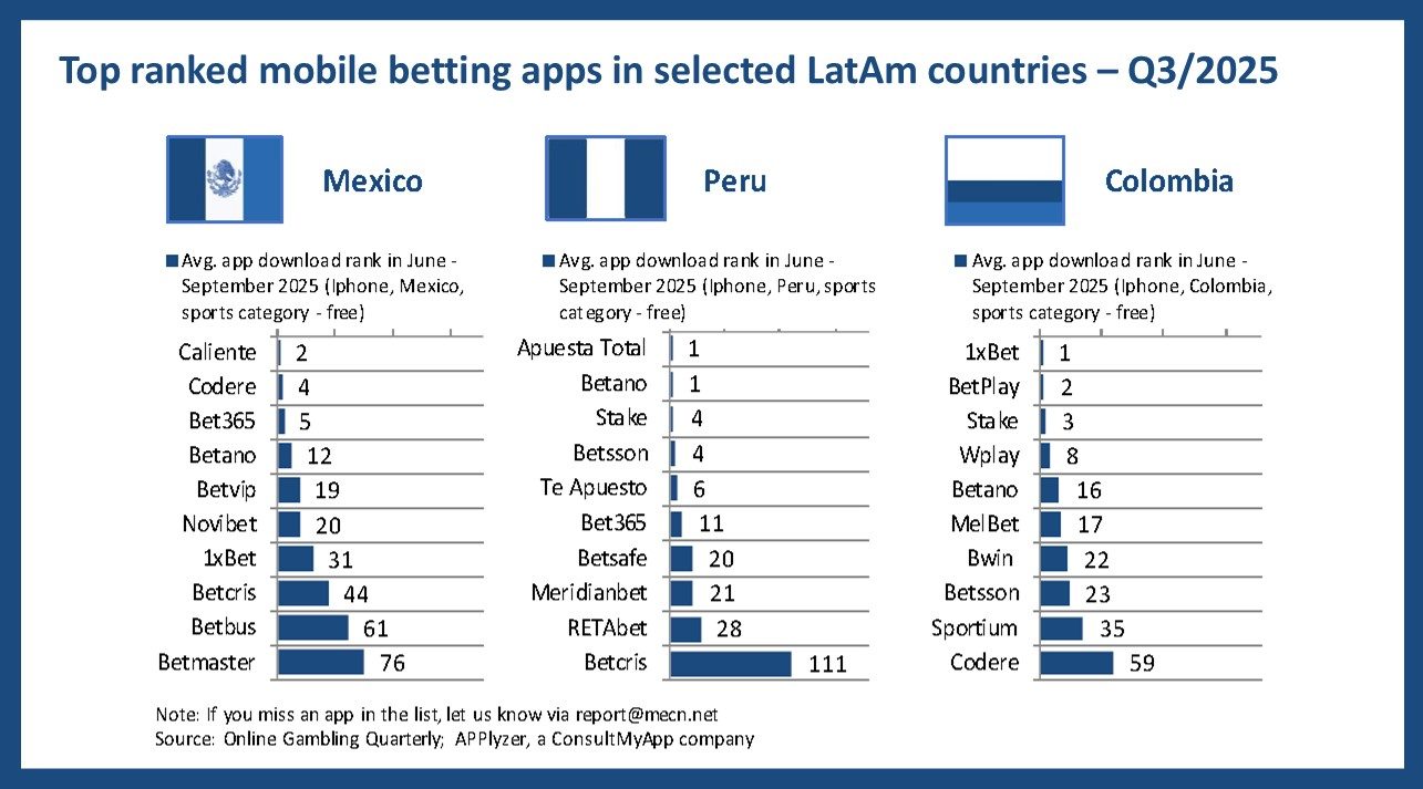 Mobile betting remained highly competitive in Q3 2025, with familiar brands dominating app rankings across Mexico, Peru, and Colombia. The charts show clear regional leaders but also strong pursuit from new entrants.