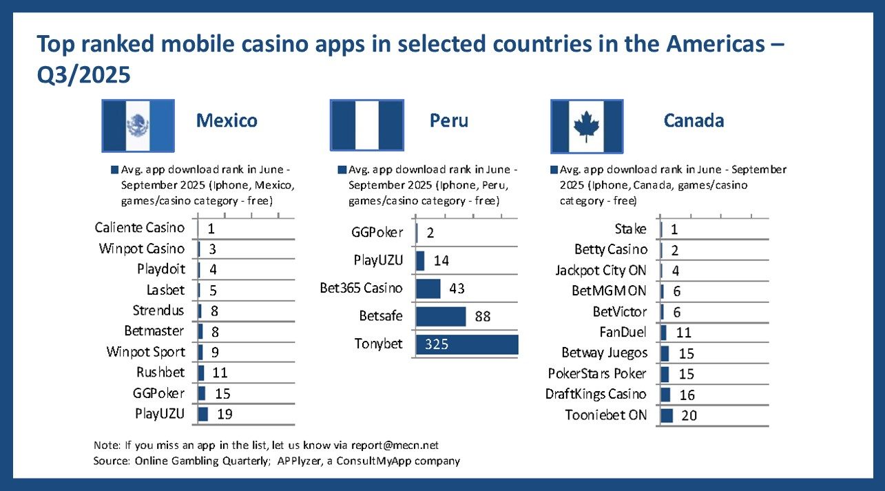 Mobile casino competition intensified across Mexico, Peru, and Canada during Q3 2025, as operators focused on app experience and retention. The data highlights diverse leaders across markets, underscoring how user preferences differ by region.