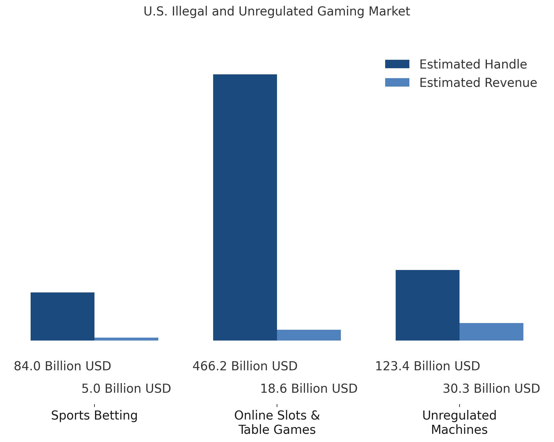 Market growth has been fuelled by a spike in illegal iGaming, the spread of unregulated “skill” machines, and ongoing offshore sports betting. While legal sports betting has gained ground, illegal operators continue to capture a third of the US market. The illegal market has grown 22% since 2022.
