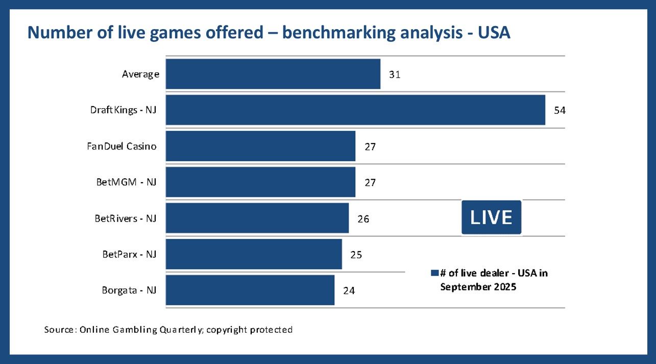 • Category leader: DraftKings – NJ dominates with 54 live titles, showing strong investment in real-time gaming technology.