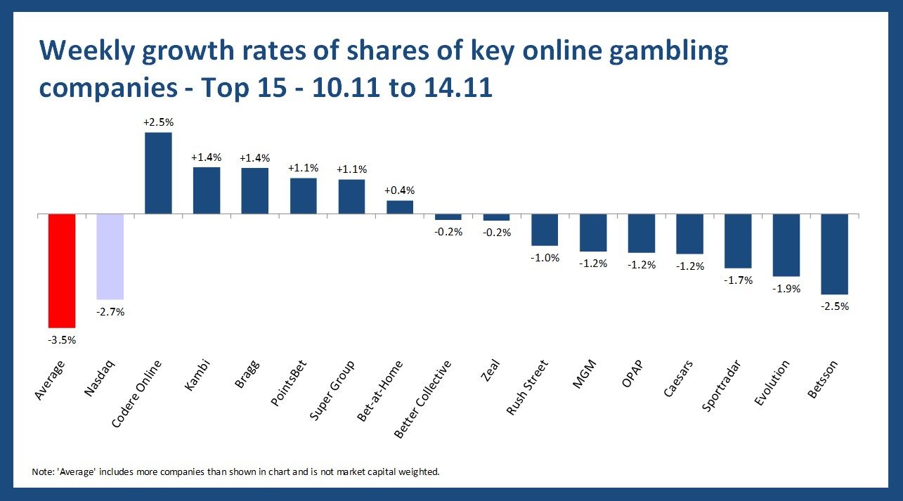 - “Loser” – Gambling.com and Flutter had the worst weekly performance in our analysis, with a change of -24% and -13%.